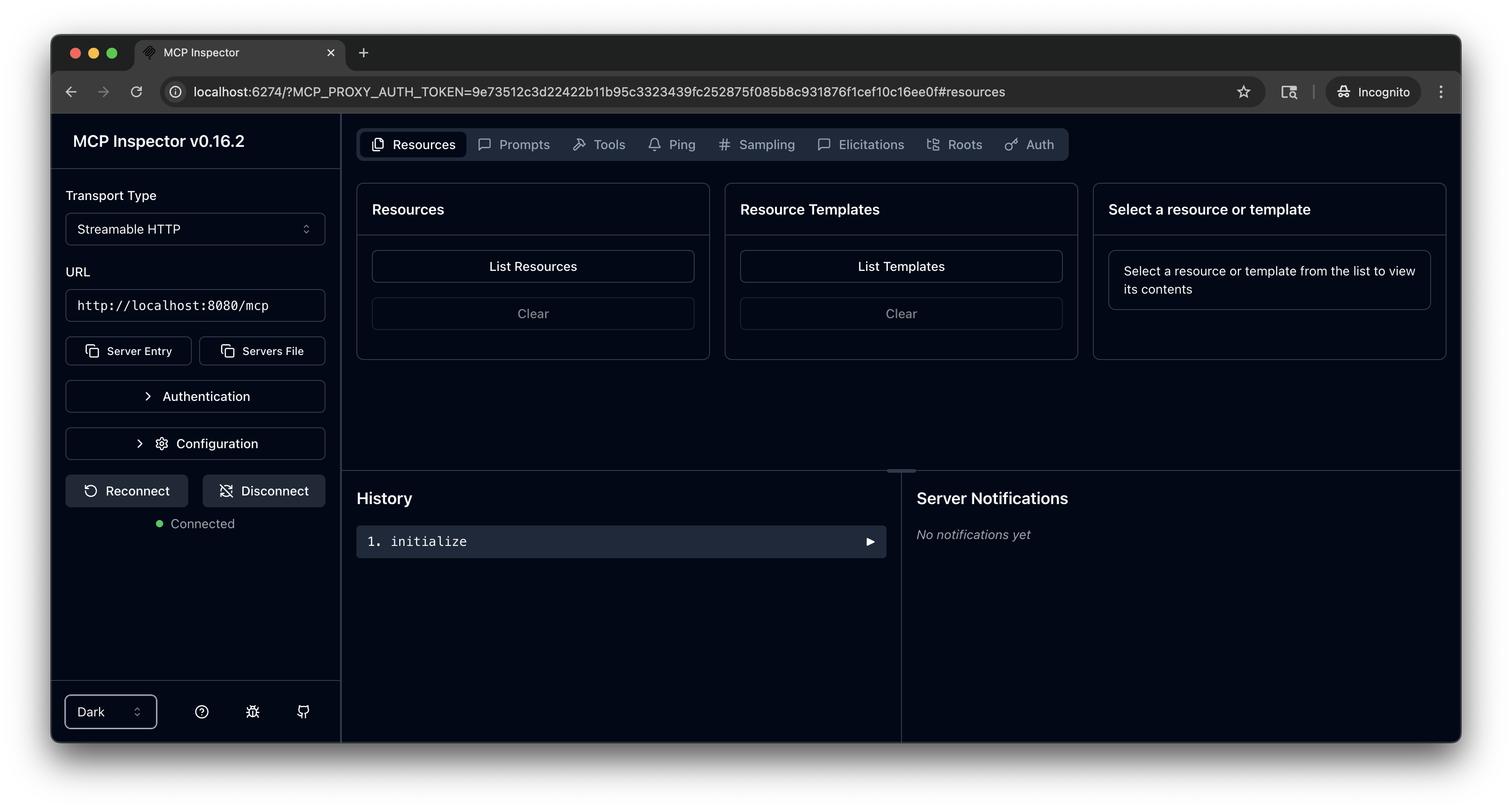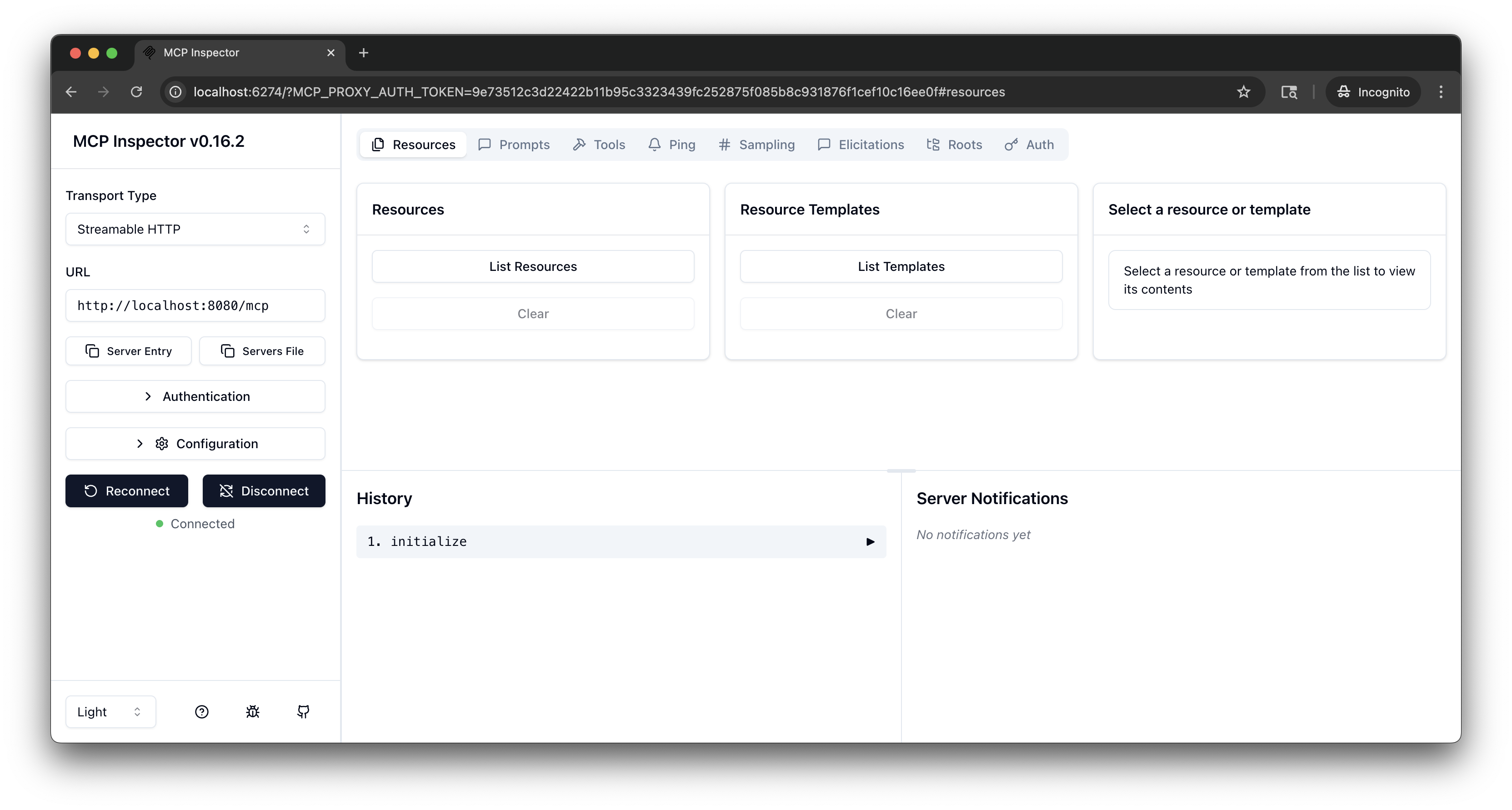 2. From the terminal, run the MCP Inspector command. Then, the MCP Inspector opens in your browser. If the MCP inspector tool does not open automatically, run mcp-inspector.