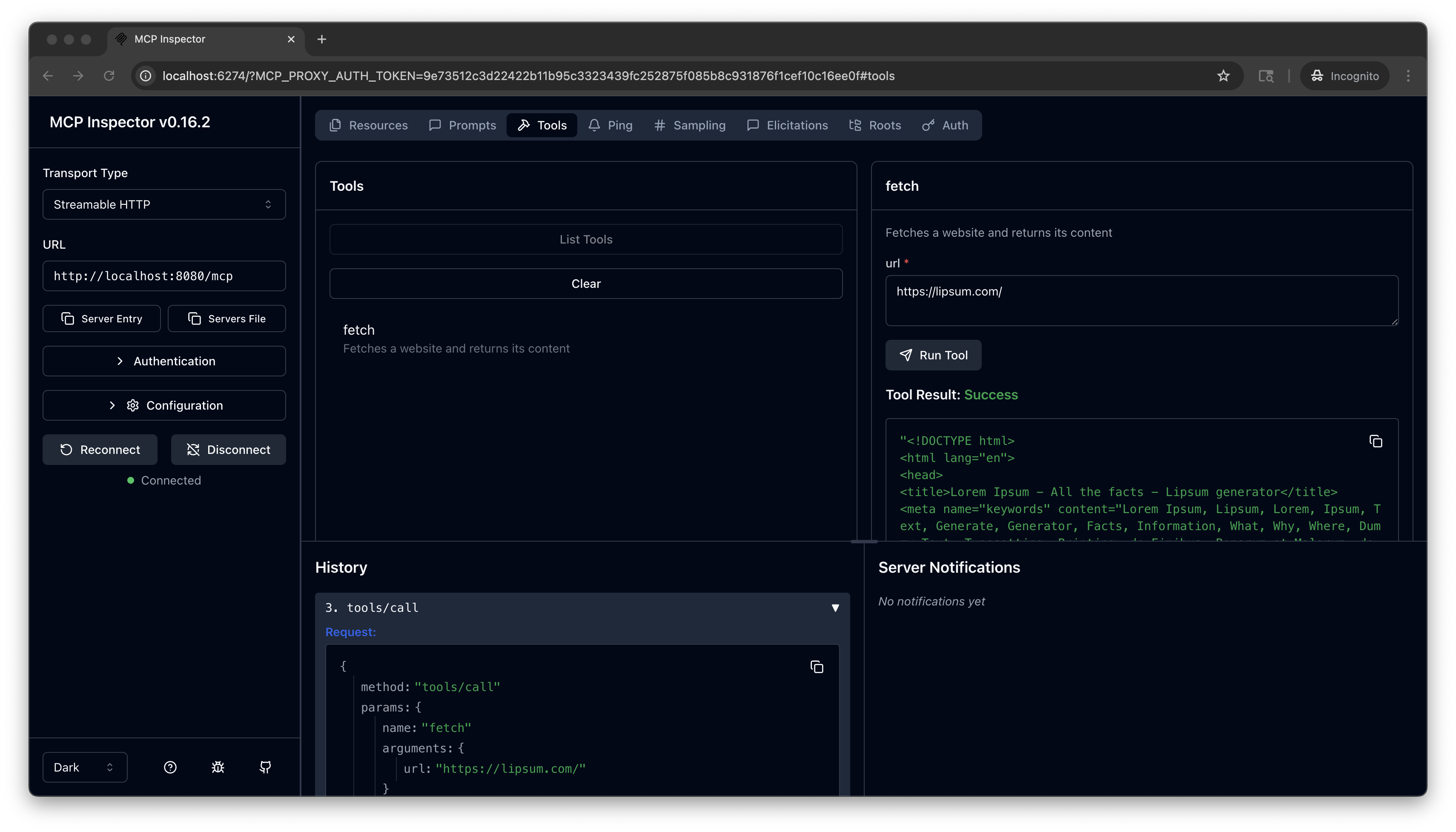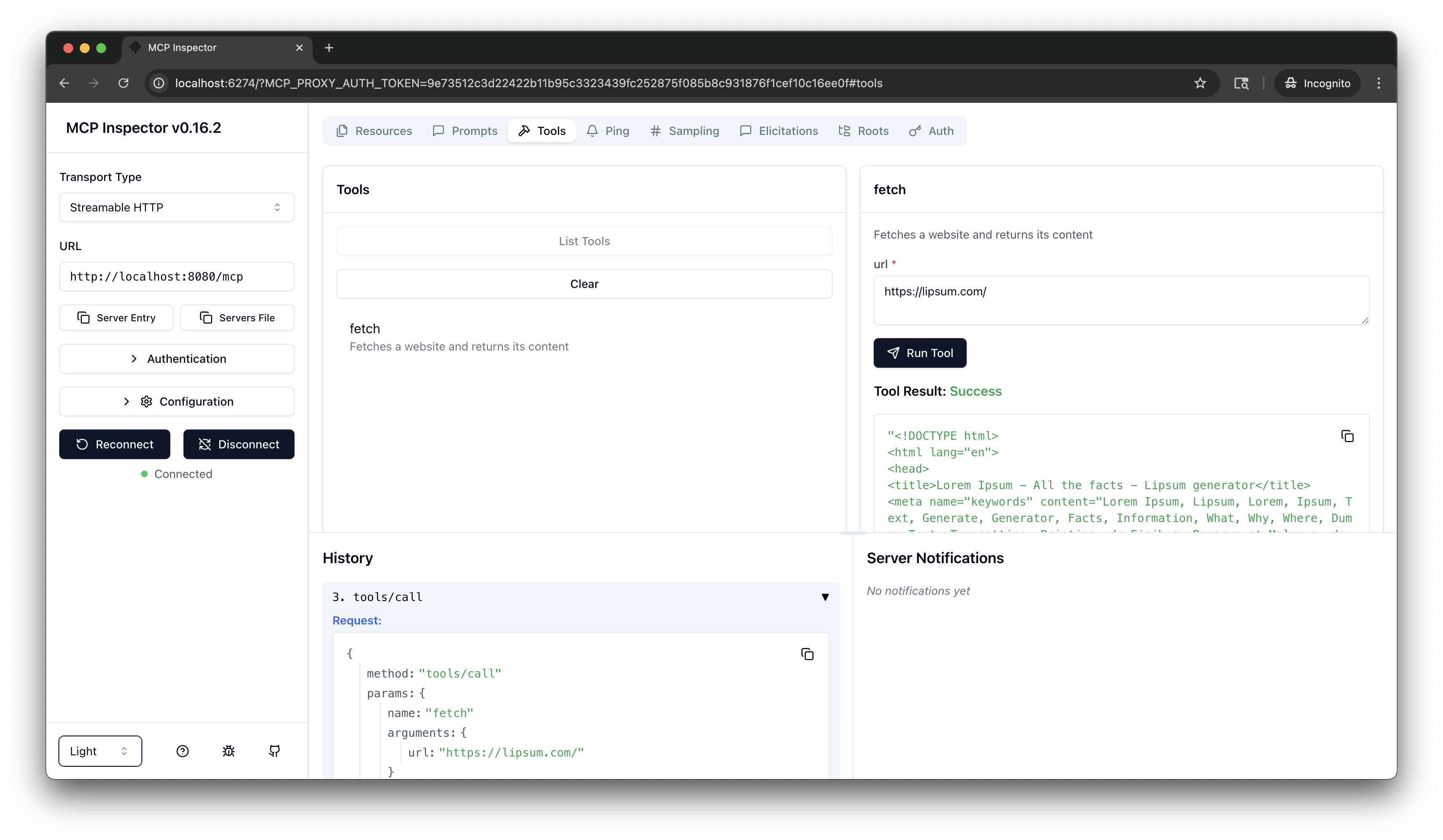 5. From the fetch pane, in the url field, enter a website URL, such as https://lipsum.com/, and click Run Tool.